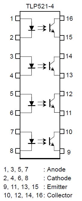 The tlp521-4bg is a TOSHIBA Photocoupler. It consists of a photo-transistor optically coupled to a gallium arsenide infrared emitting diode. The tlp521-4bg provides four isolated channels in a sixteen plastic DIP package.